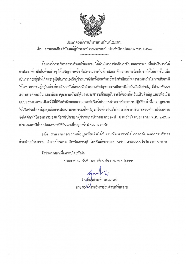 ข่าวประชาสัมพันธ์ การมอบเกียรติบัตรแก่ผู้ชำระภาษีรายแรกของปี