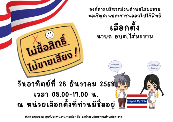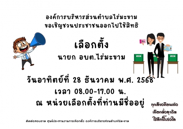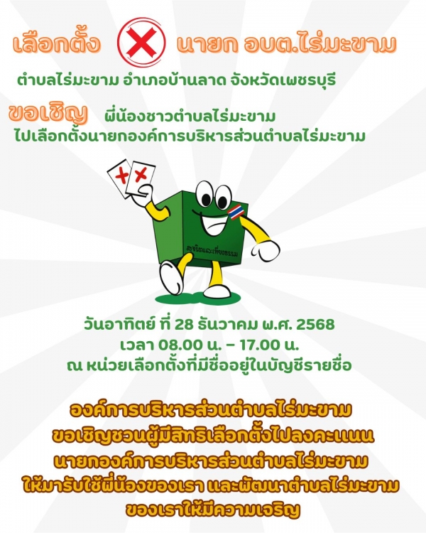 องค์การบริหารส่วนตำบลไร่มะขาม ขอเชิญชวนชาวตำบลไร่มะขาม ออกมาใช้สิทธิเลือกตั้งนายกองค์การบริหารส่วนตำบลไร่มะขาม ในวันอาทิตย์ ที่ 28 ธันวาคม 2568 เวลา 08.00 – 17.00 น. ณ หน่วยเลือกตั้งที่มีชื่ออยู่ในบัญชีรายชื่อ